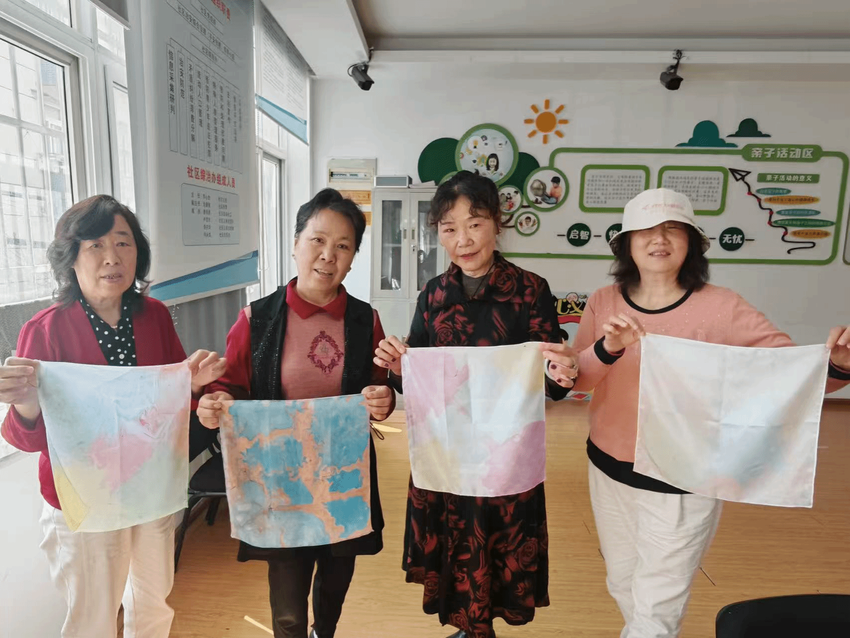 创作现场温馨热闹,各色颜料在水面晕染交融,老人们手持画针轻轻牵引,灵动花纹与独特肌理在水中绽放。当素白丝巾覆盖水面再轻轻提起,水中斑斓便完整拓印其上,成为独一无二的艺术珍品。老人们看着亲手制作的丝巾,成就感满满,相互展示交流,现场欢声笑语不断。“退休后难得有这样的动手机会,水拓画太神奇了,这条丝巾我要好好珍藏。”一位阿姨笑着说道。